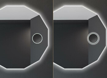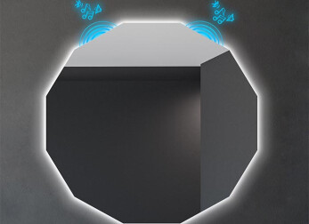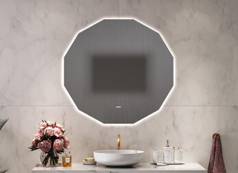 the custom-made polygon mirror perfectly to your interior. You can choose not only the size of the mirror, but also the color and power of the light it emits. Decorative LED lighting is energy-saving and safe. It creates a delicate glow on the wall that creates an atmosphere of relaxation, attracts attention and facilitates daily face and body care.